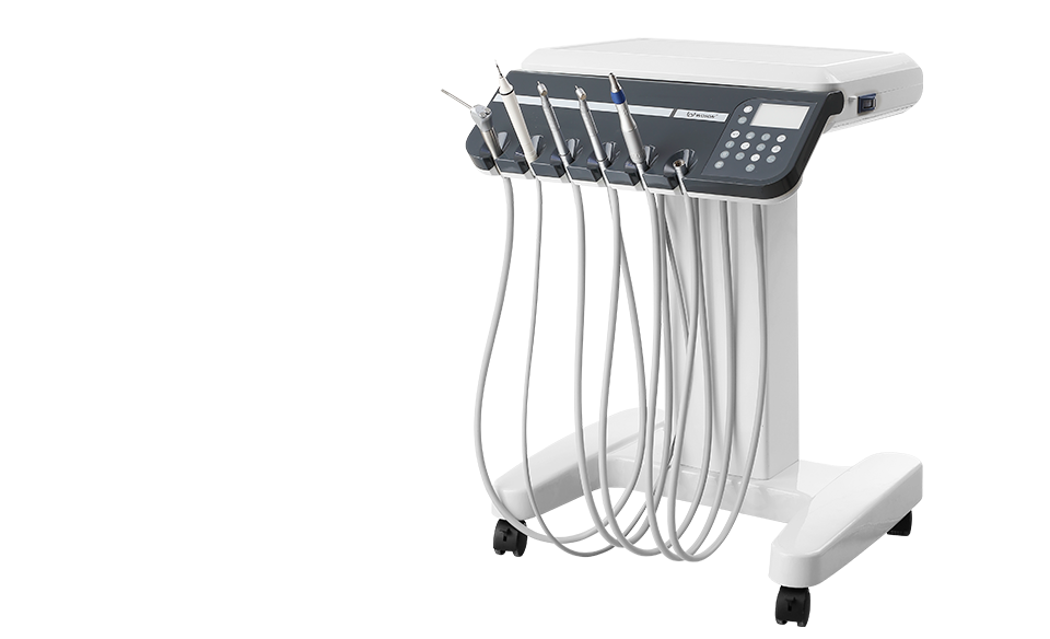 Mobile on columns, has wide working area, 5 tips of series and 1 optional, multifunction electronic control, support of points with angular adjustment, negatoscope, stop-system function and water-air-spray regulation of the tips.